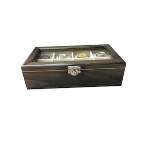 As características do estojo incluem dobradiças não aparentes com limitador, tampa com visor em vidro transparente de 2 mm e fecho giratório de pressão em metal, ideal para colocar um cadeado e garantir a segurança dos seus relógios.
