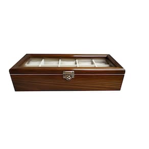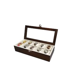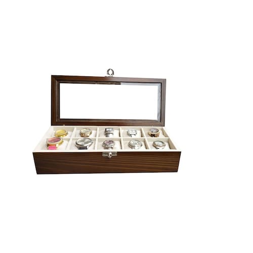 Com a Caixa/estojo para 10 Relógios Madeira Imbuia Flocado Bege, você terá a praticidade de manter sua coleção organizada e protegida, além de adicionar um toque de sofisticação e elegância ao ambiente.