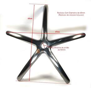 Produto com qualidade Peso Max. Recomendado: 110 kg Classificação: Giratória; com rodízios Modelo: Nacional Medidas: Expressas especificamente na última imagem do anuncio. Encaixe do Pistão: 50mm Diâmetro do Rodizio: 65mm Encaixe do Rodizio: 11x20mm Modelo rodízios: Rodizios de Silicone 65mm Estrutura: Aluminio Cor: Aluminio Para: Maioria dos modelos de cadeira de escritório giratória, atendendo desde modelos secretários até modelos presidentes, gamers, devido ao seu raio que é um dos maiores do mercado.
