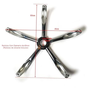 Produto com qualidade Peso Max. Recomendado: 110 kg Classificação: Giratória; com rodízios. Modelo: Nacional Medidas: Expressas especificamente na última imagem do anuncio. Encaixe do Pistão: 50mm Diâmetro do Rodizio: 65mm Encaixe do Rodizio: 11x20mm Modelo rodízios: Com bordas de silicone. Estrutura: Em Aço Cromado Cor: Cromado Para: Maioria dos modelos de cadeira de escritório giratória, atendendo desde modelos secretários até modelos presidentes, devido ao raio da estrela ser maior; somente não atende modelos gamers ou extra altos, pois o raio da estrela pode ficar pequeno.