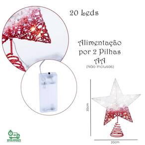 Ponteira de Árvore de Natal em formato de estrela com design moderno e elegante, ideal para dar um toque especial ao topo da sua árvore natalina. Iluminação com LEDs: A estrela é equipada com 20 LEDs de luz branco quente, que proporcionam um brilho suave e aconchegante, perfeito para criar um clima natalino acolhedor. Alimentação Prática: Funciona com 2 pilhas AA não incluídas , oferecendo praticidade e liberdade para decorar sem depender de tomadas próximas. Dimensões: Com 30 cm de altura, a estrela tem um tamanho ideal para destacar-se na árvore, trazendo charme e sofisticação. Efeito Degradê: A estrela apresenta um acabamento em degradê nas cores branco e vermelho, conferindo um visual exclusivo e harmonioso que combina perfeitamente com decorações natalinas tradicionais e modernas. Uma escolha ideal para quem busca um detalhe encantador e iluminado para complementar a decoração de Natal. Marca: Klizz