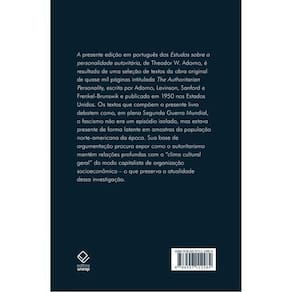 A presente edição em português dos Estudos sobre a personalidade autoritária , de Theodor W. Adorno, é resultado de uma seleção de textos da obra autêntico de quase mil páginas intitulada The Authoritarian Personality , escrita por Adorno, Levinson, Sanford e Frenkel-Brunswik e publicada em 1950 nos Estados Unidos. Os textos que compõem o presente livro debatem como, em plena Segunda Guerra Mundial, o fascismo não era um episódio isolado, mas estava presente de forma latente em amostras da população norte-americana da época. Sua base de argumentação procura expor como o autoritarismo mantém relações profundas com o “clima cultural geral” do modo capitalista de organização socioeconômica – o que preserva a atualidade dessa investigação.