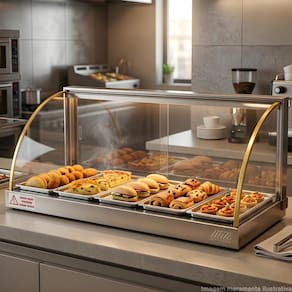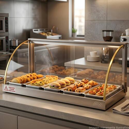 Valorize seus produtos e chame ainda mais a atenção dos clientes com a Estufa Tita de 5 Bandejas. Com design elegante em vidro curvo e acabamento com filete dourado, ela é perfeita para destacar salgados, lanches e outros alimentos, mantendo tudo sempre aquecido e pronto para servir. Perfeita para padarias, lanchonetes, cafeterias e conveniências, a estufa oferece excelente visibilidade dos alimentos graças ao seu visor panorâmico. Suas bandejas proporcionam boa capacidade de exposição, ajudando a organizar melhor os produtos e incentivar a compra por impulso. Prática e eficiente, funciona em 127V e foi desenvolvida para o uso diário em estabelecimentos comerciais. Uma solução simples e elegante para manter seus alimentos aquecidos, bem apresentados e sempre prontos para conquistar seus clientes.
