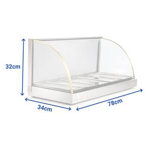 Características Técnicas: Estrutura em aço inox brilhante Bandejas em aço inox estampado Vidros temperados com 4mm de espessura Resistência tubular de 500W Termostato para controle de temperatura (20C - 120C) Fio em silicone 1,00 MM 300C / 750V Cabo elétrico 3 x 0,75 mm x 1,0 m plugue BR 180 2P+T Consumo: 0,500 Kwh Capacidade interna: 36 Litros Dimensão da bandeja: altura: 1,3cm | largura: 14cm | profundidade: 28cm Não possui iluminação **