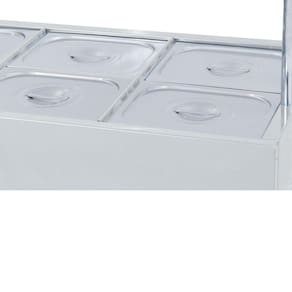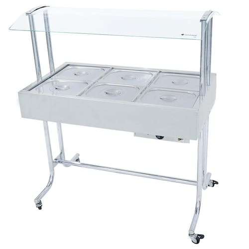 Possui cobertura em vidro curvo inteiro de 4 mm, para melhor visibilidade e higiene ao servir as refeições. Além disso, o carro buffet aquecido possui 6 cubas quentes 1/2 feitas em aço inox e de acordo com o padrão mundial Gastronorm.