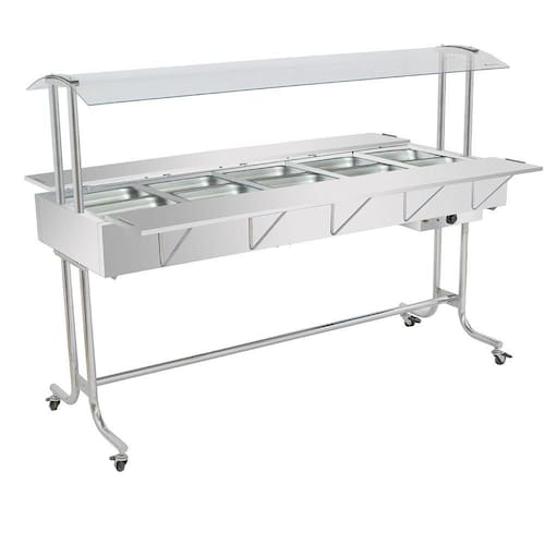 Desenvolvida para estabelecimentos que necessitam de um equipamento robusto e eficiente para manter os alimentos aquecidos, a estufa de aquecimento Master com 10 cubas é confeccionada com um design arrojado e matérias-primas de primeira. É indicada para ser utilizada em restaurantes, bares, lanchonetes, buffets, espaços de festas, refeitórios e muitos outros locais que precisam servir os alimentos aquecidos, mantendo sua qualidade e sabor. Esta estufa carro buffet aquecido possui o corpo e banho-maria confeccionados em aço inoxidável 430, proporcionando muito mais durabilidade e resistência ao equipamento. Conta com uma cobertura em vidro curvo inteiro de 4mm para proteger os alimentos expostos e garantindo muito mais higiene, além de contar com pés cromados confeccionados em tubo inteiro, ou seja, é totalmente livre de solda em sua base, permitindo maior estabilidade a estufa de aquecimento para alimentos. Suas 10 cubas GN 1/2 quentes são fabricadas em aço inoxidável, seguindo as regras e padrão mundial Gastronorm, para melhor utilização e segurança. Também possui um exclusivo sistema de platibanda, servindo como tampa para as cubas GN apoiada através de mão francesa. Seus rodízios possuem trava, evitando o deslocamento do equipamento durante o uso e um termostato que vai de 20C a 80C para o controle de temperatura.