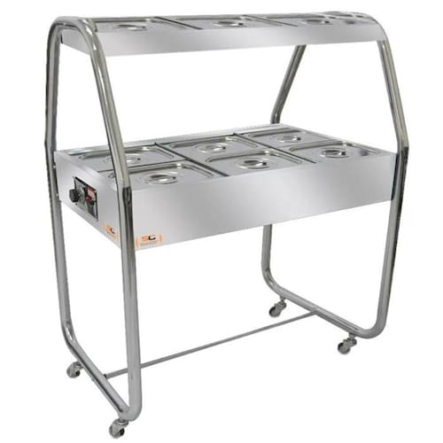 Fabricada para oferecer resistência e durabilidade, sua estrutura é confeccionada em aço inoxidável 430 e estrutura tubular 1.1/2 curvada em máquina especial, com acabamento cromado. Possui rodízios com trava para evitar o deslocamento durante o uso e controle de temperatura ajustável por termostato, que varia de 20C a 80C, garantindo o aquecimento ideal dos alimentos.