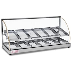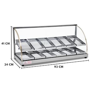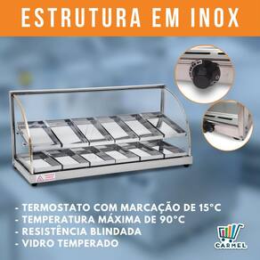 Uma excelente opção econômica para seu estabelecimento. Fabricada toda em inox, com acabamento e bandejas internas em aço inox brilhante. Possui resistência blindada e termostato para controle de temperatura, cada marcação do termostáto representa aproximadamente uma temperatura de 15 C. Todos os vidros são temperados. Perfeita para expor seus alimentos de forma elegante. Não possui iluminação.