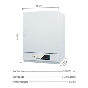 Características: Capacidade: 40 litros. Potência: 550 watts. Material: Chapa de aço carbono SAE 1020. Acabamento: Pintura eletrostática epóxi texturizada, resistente e durável. Vedação: Perfil de silicone de alta temperatura para máxima eficiência térmica. Trilhos Internos: Permitem o fácil deslocamento das bandejas. Fechamento: Sistema de fecho tipo rolete, garantindo segurança e vedação. Controle Digital: Ajuste preciso da temperatura para diferentes necessidades. LED Indicador: Indica as fases do processo. Chave Geral Liga/Desliga: Praticidade no uso. Porta Fusível: Segurança elétrica adicional. Controlador Eletrônico: Oferece estabilidade e eficiência nos processos. Adesivo do Painel: Fabricado em policarbonato, resistente ao desgaste. Dimensões Externas: Altura 55 cm x Largura 45 cm x Comprimento 52 cm. Dimensões Internas: Altura 34 cm x Largura 34 cm x Comprimento 36 cm. Bandejas Inclusas: 3 bandejas removíveis de fácil manuseio.