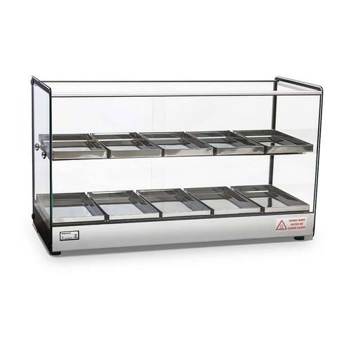 Estufa Quadrada 5 Bandejas Duplas Titã. Estufa para salgado EVR Titã estrutura em perfil de alumínio anodizado e aço inox. Vidros temperados. Acompanha 10 Bandejas em aço inox. Controle de temperatura com termostato analógico. Iluminação LED. Resistência elétrica em aço inox 304 tubular. DIMENSÕES (CxAxL) 77x45x36cm. POTÊNCIA: 504w. CONSUMO: 0,5Kwh. Medida das bandejas (CxAxL) 14x2x28cm. Estufa EVR Titã design clean e compacto que confere melhor visualização dos produtos e modernidade ao seu estabelecimento. TITÃ é na ATAU.