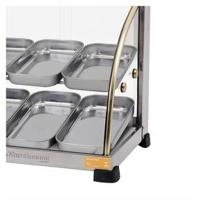 Estufa para salgados ouro de 10 bandejas curva - marchesonise você é proprietário de um bar, lanchonete, padaria ou restaurante, não poderá ficar sem este produto em seu estabelecimento uma maneira prática e eficaz de preservar seus salgados, além de mantê-los mais quentes durante um maior período de tempo. O umidificador, ajuda a evitar que os alimentos sejam desidratados e ressecados, preservando assim, sua textura e sabor. Características:bandejas em aço inoxidável com 3 cm de altura;perfil/friso dourado em plástico abs. Elegantes frisos dourados;termostato bimetálico regulável para economia de energia elétrica;resistência tubular de baixo consumo 250 w - 0,25 kwh;umidificador. Seus produtos sempre fresquinhos;ideal para conservar salgados, pastéis, assados em geral esfihas, croissants, tortas, empadas . Especificações: marca: marchesoni modelo: ef.2.031-032 bandejas: 10 comprimento: 68 cm largura: 33,5 cm altura: 37 cm peso: 12 kg alimentação:220 v consumo: 250w / 0,25kw/h umidificador: sim certificação do inmetro: bra ho 13/0172