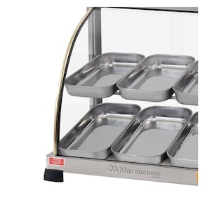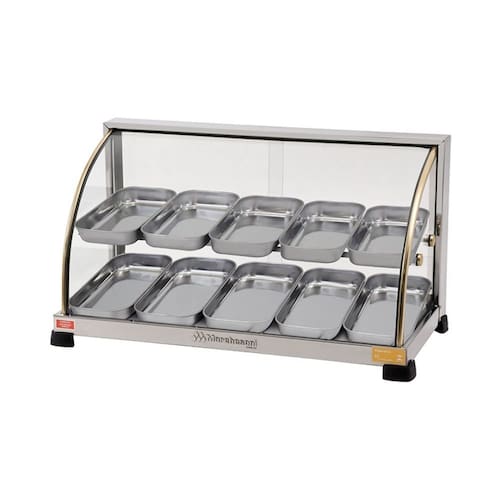 DescriçãoBandejas em aço inoxidável com 3 cm de altura;Elegantes frisos dourados;Termostato bimetálico para economia de energia elétrica;Resistência tubular de baixo consumo;Vidros Temperados: maior segurança;Umidificador: Seus produtos sempre fresquinhos;Ideal para expor e conservar alimentos sempre quentinhos.Indicadas para bares, padarias, restaurantes, cafeterias, lanchonetes, lojas de conveniência e serviços de alimentação em geral.