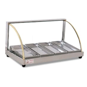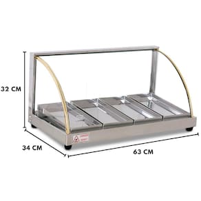 Uma excelente opção econômica para seu estabelecimento. Fabricada toda em inox, com acabamento e bandejas internas em aço inox brilhante. Possui resistência blindada e termostato para controle de temperatura, cada marcação do termostáto representa aproximadamente uma temperatura de 15 C. Todos os vidros são temperados. Perfeita para expor seus alimentos de forma elegante. Não possui iluminação.