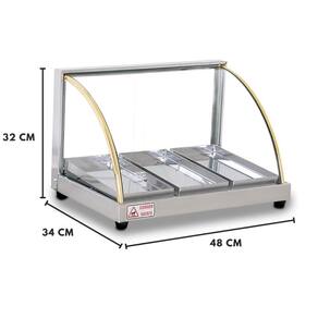 Uma excelente opção econômica para seu estabelecimento. Fabricada toda em inox, com acabamento e bandejas internas em aço inox brilhante. Possui resistência blindada e termostato para controle de temperatura, cada marcação do termostáto representa aproximadamente uma temperatura de 15 C. Todos os vidros são temperados. Perfeita para expor seus alimentos de forma elegante. Não possui iluminação.