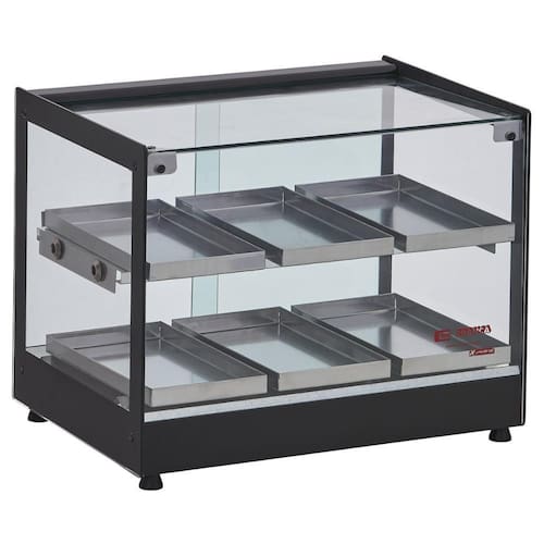 Expositor de salgados com a estrutura toda em vidro e acabamento em Inox, a Estufa Reta com 6 bandejas possui design moderno e robusto, resistência blindada e portas de vidro 5 mm.