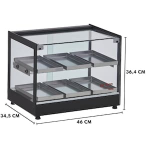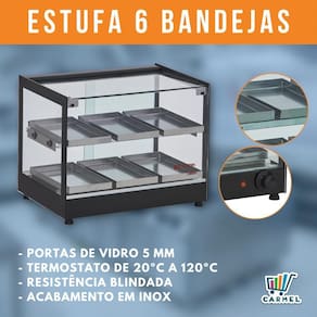 Possui termostato para regular temperatura de 20 até 120 Graus C, mantendo quente e conservando os alimentos como diversos tipos de salgados, pães de queijo, folhados, esfirras, croissants, pastéis, etc.