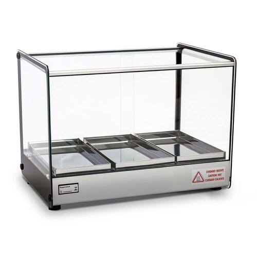 Estufa Quadrada 3 Bandejas Titã. A Estufa para salgado EVR Titã possui estrutura em perfil de alumínio anodizado e aço inox. Vidros temperados. Acompanha 3 Bandejas em aço inox. Controle de temperatura com termostato analógico. Iluminação LED. Resistência elétrica em aço inox 304 tubular. DIMENSÕES (CxAxL): 47x35x36cm. POTÊNCIA: 252w. CONSUMO: 0,2Kwh. Medida das bandejas (CxAxL): 14x2x28cm. Estufa EVR Titã é na Atau.