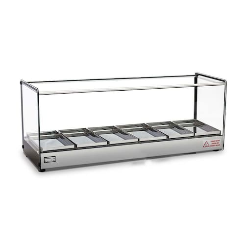 Estufa Quadrada 6 Bandejas Titã. Estufa para salgado EVR Titã estrutura em perfil de alumínio anodizado e aço inox. Vidros temperados. Acompanha 4 Bandejas em aço inox. Controle de temperatura com termostato analógico. Iluminação LED. Resistência elétrica em aço inox 304 tubular. DIMENSÕES (CxAxL) 92x35x36cm. POTÊNCIA: 604w. CONSUMO: 0,6Kwh. Medida das bandejas (CxAxL) 14x2x28cm. Estufa EVR Titã design clean e compacto que confere melhor visualização dos produtos e modernidade ao seu estabelecimento. TITÃ é na ATAU.