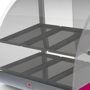 Essa Estufa para Salgados conta com estrutura em aço inox escovado e perfil de alumínio anodizado, sendo seus vidros temperados que garantem mais proteção contra quebra.