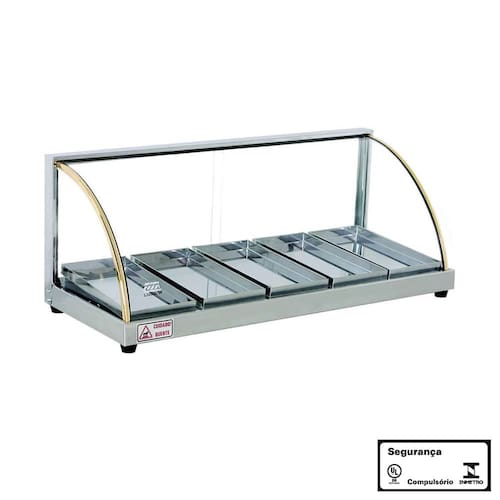 Quantidade de bandejas: 5 Tensão: 220 V Corrente: 2,27 A Potência: 500 W Frequência: 50/60 Hz Comprimento: 78 cm Largura: 34 cm Altura: 32 cm Dimensões das Bandejas CxLxA: 14x28x2 cm Aço inox brilhante Bandeja em aço inox Porta em vidro transparente Resistência blindada Termostato Vidro transparente