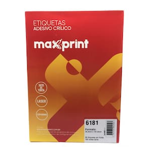 ETIQUETA Adesiva LASER/INK tamanho 25,4mm x 101,6mm Ref 6181 Caixa com 100 Folhas - Maxprint Etiquetas indicadas para impressoras Jato de tinta inkjet e laser de uso doméstico ou corporativo e Copiadora. Tipo de Adesivo: Acrílico padrão de Mercado Compatível com: Impressoras Jato de Tinta, Laser e copiadora. Modelo: 6181 Tamanho Folha: Carta Formato Etiqueta: 25,4mm x 101,6 mm Quantidade de Etiquetas por Folha: 20 Etiquetas Cor: Branca Contém: 01 - Caixa de Etiqueta 6181 em folha, tamanho 25,4mm x 101,6mm, caixa com 100 folhas Ean: 7897975002503