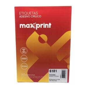 ETIQUETA Adesiva LASER/INK tamanho 25,4mm x 101,6mm Ref 6181 Caixa com 100 Folhas - Maxprint Etiquetas indicadas para impressoras Jato de tinta inkjet e laser de uso doméstico ou corporativo e Copiadora. Tipo de Adesivo: Acrílico padrão de Mercado Compatível com: Impressoras Jato de Tinta, Laser e copiadora. Modelo: 6181 Tamanho Folha: Carta Formato Etiqueta: 25,4mm x 101,6 mm Quantidade de Etiquetas por Folha: 20 Etiquetas Cor: Branca Contém: 01 - Caixa de Etiqueta 6181 em folha, tamanho 25,4mm x 101,6mm, caixa com 100 folhas Marca: Não Informado Ean: 7897975002503