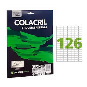 - Marca: Colacril - Modelo: Etiqueta Adesiva - Referência: CA4249 - Cor: Branco - Etiqueta retangular - Formato da folha: A4 - Contém: 3150 etiquetas - 126 etiquetas por folha e 25 folhas por embalagem - Impressão: Inkjet e Laser - Dimensões da etiqueta: 26 x 15mm LxA - Composição: papel com adesivo acrílico Marca: Não Informado