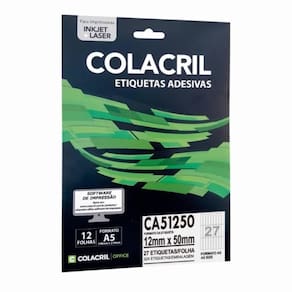 - Marca: Colacril - Modelo: Etiqueta Adesiva - Referência: CA51250 - Cor: Branco - Etiqueta retangular - Formato da folha: A5 - Contém 96 etiquetas - 27 etiquetas por folha e 324 folhas por embalagem - Impressão: Inkjet e Laser - Dimensões da etiqueta: 12,0mm x 50,0mm LxA - Composição: papel com adesivo acrílico