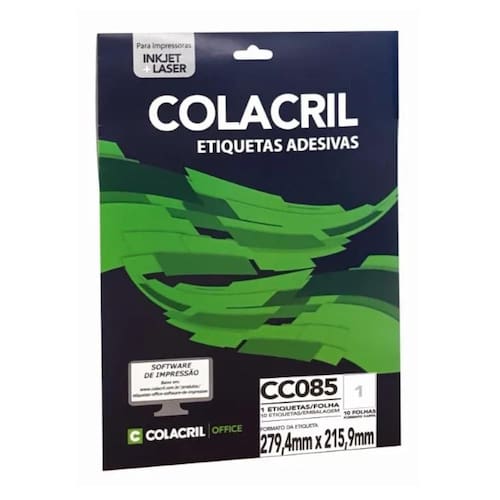 Etiqueta Adesiva Colacril Carta CC085 279,4x215,9mm C/10 As etiquetas Colacril podem ser utilizadas em casa ou no trabalho, assim identificando e mantendo a organização. Ideal para uso em arquivos, caixas, correspondências, documentos, encomendas, impressão de código de barras, mala direta, pastas, pequenos objetos, separação de materiais, entre outros.