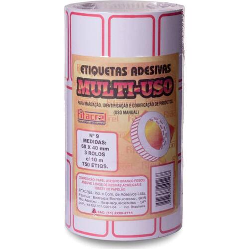 Etiqueta Para Preço 60X40Mm Com 750 Etiquetas Etiqueta Multiuso nº9 Pacote com 3 rolos Cor: Branco Contem: 3 Rolos com 750 unidades Este é um produto excelente. Seu uso é de extrema qualidade e precisão. Produzido com materiais de qualidade, atenderá muito bem suas necessidades.