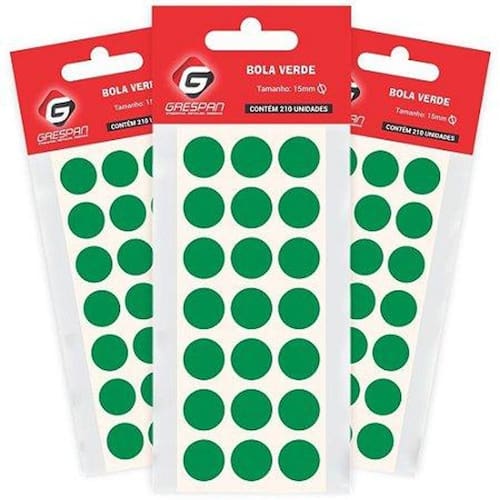 Ficha Técnica: Marca: Grespan Modelo: Etiqueta Redonda Verde 19mm Quantidade: 210 unidades Tamanho: 19mm de diâmetro Formas de Pagamento
