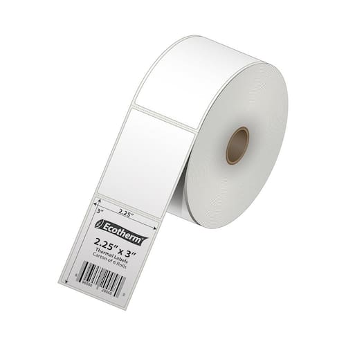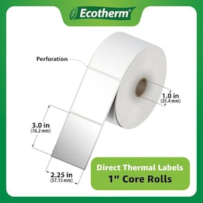 Ecotherm 2,25 x 3 etiquetas térmicas diretas em um rolo - O diâmetro do núcleo do rolo é de 2,5 cm - O diâmetro externo do rolo não excede 12,7 cm - Compatível com impressoras Zebra: ZD220, ZD410, ZD411, ZD421, ZD620, ZD621, GC420, GK420, GX430, LP2824, LP2844, ZP500. - Resistente à luz UV. Temperatura de serviço: -4F a 158F. Qualidade de impressão: impressão clara e de alto contraste sem manchas ou desbotamento ao longo do tempo. - Fácil de descascar: com um adesivo permanente à base de borracha de alta aderência para caixas, papelão, vidro, caixas onduladas, paletes, metal, papel, plástico bolha, sacos de poliéster, embalagem retrátil e correspondências. - Segurança: as etiquetas térmicas Ecotherm Direct são livres de BPA, garantindo que sejam seguras para uso em embalagens de alimentos e outras aplicações onde a segurança do produto é uma preocupação. - As aplicações incluem: etiquetas de envio, etiquetas de preço, etiquetas de código de barras, etiquetas de inventário, etiquetas FBA, etiquetas de endereço, etiquetas de pasta de arquivo, etiquetagem em processo de trabalho e muito mais