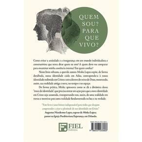 QUEM SOU? PARA QUE VIVO? Como evitar a ansiedade e a insegurança em um mundo individualista e construtivista que tenta ditar quem eu sou? A quem devo me comparar para encontrar minha coerência interna? Em quem con ar? Neste livro robusto, a querida autora Minka Lopes expõe, de forma detalhada, nossa identidade caída em Adão, contrapondo-a à nossa identidade redimida em Cristo e ativa dentro do reino de Deus, mostrando, assim, sua realidade antiga e nova, no tempo e no espaço. De forma prática, Minka apresenta como se dá a dinâmica dessa “troca de identidade”, que precisa entrar em ação para que a nova identidade em Cristo seja assumida, transportando-nos, assim, de uma realidade em trevas e mentiras para uma realidade fundamentada na luz e na verdade.