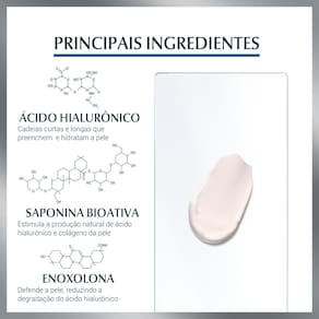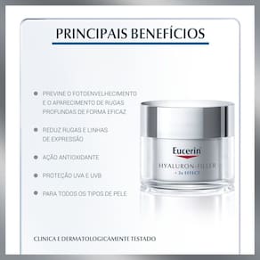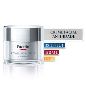 EUCERIN HYALURON-FILLER DIA FPS 30 CREME FACIAL ANTI-IDADE Hyaluron-Filler Dia FPS 30 é um creme para uso diário que possui cadeias curtas e longas de Ácido Hialurônico e Saponina Bioativa, que aument