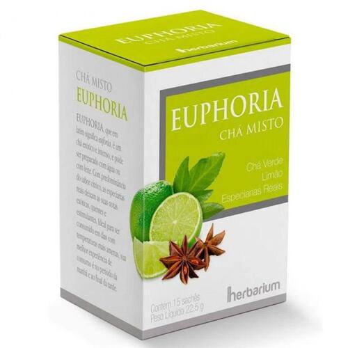 Euphoria Chá Misto c/15 sachês Herbarium Descrição: Chá Verde, Limão e Especiarias Reais. EUPHORIA, que em latim significa euforia, é um chá exótico e intenso, e pode ser preparado com água ou com leite. Com predominância do sabor cítrico, as especiarias reais deixam as suas notas exóticas, quentes e estimulantes. Ideal para ser consumido em dias com temperaturas mais amenas, sua melhor experiência de consumo é no período da manhã e ao final da tarde.