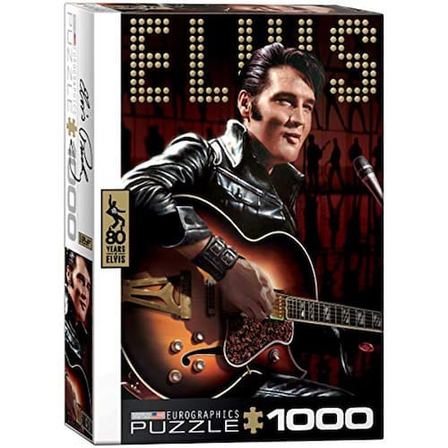 EuroGraphics Elvis Portrait 1000-Piece Puzzle. Simplesmente conhecido como O Rei, Elvis Presley mudou de música para sempre como um dos fundadores do Rock n Roll. Tamanho da caixa: 10" x 14" x 2,37". Tamanho finalizado: 19,25" x 26,5".