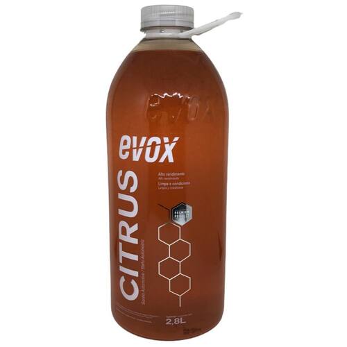 Evox citrus 2,8l Shampoo neutro citrus 2,8l Citrus é um produto de alto rendimento com ph neutro que limpa, mantém e renova o brilho da pintura sem remover ceras ou selantes da superfície. Seu alto rendimento permite diluição de até 1:400.