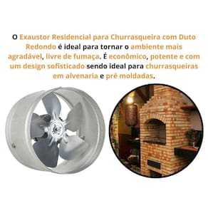 Exaustor churrasqueira residencial duto redondo 22cm bivolt O exaustor residencial para churrasqueira com duto redondo é ideal para tornar o ambiente mais agradável, livre de fumaça. Sua estrutura é feita em aço galvanizado, com motor weg de grande durabilidade. É econômico, potente e com um design sofisticado sendo ideal para churrasqueiras em alvenaria e pré moldadas. É bivolt, fabricado no brasil e possui certificado do inmetro, além de ter 12 meses de garantia. Surpreenda-se com a qualidade desse produto e faça bom proveito.