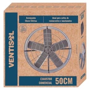 Exaustor alta vazão industrial 50 cm Ventisol Descrição do ProdutoIdeal para coifas de restaurantes e lanchonetes.Tensão: 220V monofásico Potência: 1/4CVVazão: 5000m3/h1200 RPM - 50/60HzDiâmetro: 50x20cm - aço 22 Acompanha chave de reversão