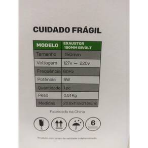 Características técnicas: Cor branca; Utilidades: Proporcionar exasutão permanente de ar; Arejar ambientes para prevenir a formação de mofo ou bolor; Ventilar espaços para evitar umidade e odores; Proporcionar a exaustão em ambientes; Marca: Não Informado