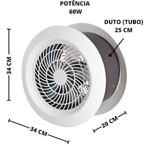 Características: -ideal para: Ambientes com 5m -potência: 1/4 CV - 60W -vazão: 685 metros/h -rotação por minuto: 1.550 rpm -especificações: -potência: 1/40 CV -vazão: 685 metros / hora -rotação por minuto: 1450 rpm -diâmetro do duto: 25 cm. -acompanha Grade: Sim -material da Grade: Plástico -cor da Grade: Branco -peso do Produto: 2,55 Kg -material: metal -tipo de Material: Aço -frequência: 60 Hz -cor: Branco -altura: 34cm -largura: 34cm -comprimento: 20cm