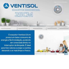 O exaustor Ventisol 25cm é a escolha perfeita para retirar odores e vapores do seu banheiro ou cozinha. Sua instalação é simples e pode ser ligado junto ao interruptor da lâmpada. Além de retirar os gases e vapores, também areja o ambiente.
