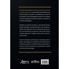 Excelência Odontológica: transforme a gestão da sua clínica e encante pacientes é um guia prático para dentistas que buscam melhorar a gestão e a qualidade dos serviços de suas clínicas. Com uma linguagem acessível, o livro adapta conceitos de gestão de grandes empresas e hospitais ao contexto odontológico. Dividido em capítulos temáticos, a obra aborda desde a gestão estratégica, comunicação eficaz com pacientes e equipe, até a segurança clínica, mapeamento de processos e encantamento do paciente. Cada seção oferece métodos aplicáveis e insights valiosos para a administração clínica. Este livro inovador contribui para a atualização sobre a gestão odontológica de excelência para profissionais e estudantes, gestores e administradores, destacando-se como um recurso essencial para transformar a prática nas clínicas de odontologia.