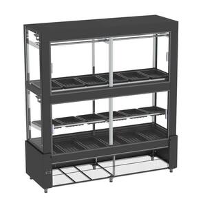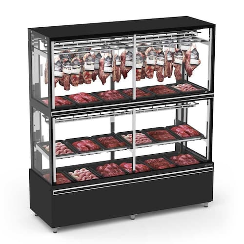 - Refrigeração: Estático; - Iluminação em LED 3000K; - Controlador digital de temperatura; - Gabinete interno em aço inox 430; - Gabinete externo em aço galvanizado pintado; - Isolamento térmico em poliuretano injetado; - Vidros frontais e laterais duplos, temperados e com aquecimento; - Portas traseira deslizantes em vidro temperado (compartimento superior); - Portas traseira de bater em aço galvanizado pintado (compartimento inferior); - Bandejas em polipropileno atóxico inclusas; - Prateleiras com grade para apoiar as bandejas; - Gancheira dupla em aço inox; - Bate carrinho em alumínio; - Pés altos termoplásticos com regulagem de altura.