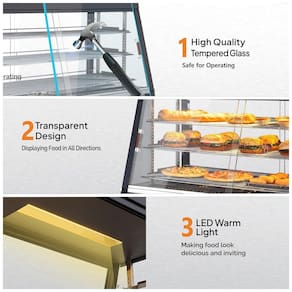 O Expositor Aquecedor de Alimentos ROVSUN 3 Níveis é um equipamento de bancada com estrutura em aço inoxidável anticorrosivo e paredes de vidro temperado em quatro faces, projetado para exposição térmica de pizzas, pretzels, hambúrgueres e massas em cafeterias, fast-foods, padarias e buffets comerciais. Equipado com bulbo superior para iluminação uniforme, oferece visibilidade em 360 graus, enquanto as portas corrediças frontais e traseiras facilitam autoatendimento e abastecimento. ?
