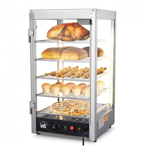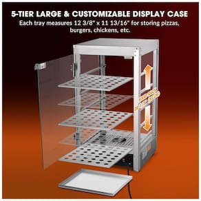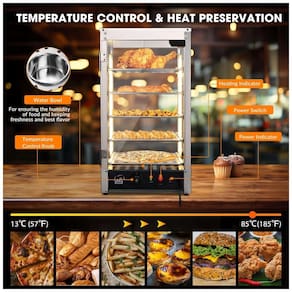 O Expositor Aquecedor de Alimentos Comercial WeChef 5 Andares de 600W oferece 5 prateleiras para armazenamento otimizado, compatível com pizzas de até 28 cm por nível, economizando espaço no balcão em cafés, conveniências e estabelecimentos comerciais. Controle de temperatura termostático com knob rotativo ajusta de 14°C a 85°C, mantendo calor constante e protegendo contra superaquecimento para operação precisa em ambientes de alto volume.
