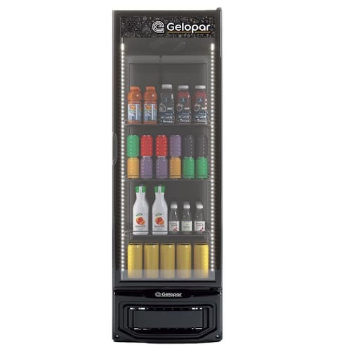 Expositor de Bebidas 445L GRV45BINLB Gelopar. Ideal para lanchonetes, bares, restaurantes e similares. Conservação e exposição de bebidas, frios e laticínios. Temperatura: 0° a +7°. Refrigeração por ar forçado com evaporador aletado. Compressor Inverter (VCC). Controle de Temperatura: Termostato eletrônico. Degelo: Manual. Iluminação: LED perimetral com interruptor. Porta de vidro duplo temperado baixo emissivo. Prateleiras: 3 níveis reguláveis e inclináveis. Revestimento: Interno e externo em aço pré-pintado preto. Vidros sujeitos a condensação da umidade do ar. PORTAS: 1. FREQUÊNCIA: Bivolt e bi-frequência (127-220V 50/60Hz). PLANO DE CARGA: 384 latas 350ml ou 224 long necks 350ml ou 168 garrafas 600ml. CAPACIDADE: 445 litros. CONSUMO: 2,24kWh/dia. PESO: 94kg. DIMENSÕES(CxAxP): 64,5x196,2x64,5cm. Equipamento certificado conforme Portaria Inmetro nº 148/2022. Expositor de Bebidas 445L GRV45BINLB Gelopar é na Atau.
