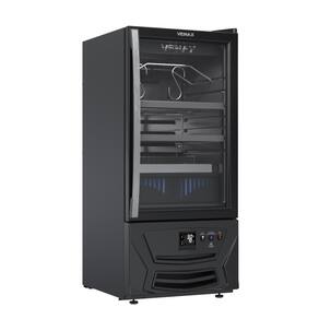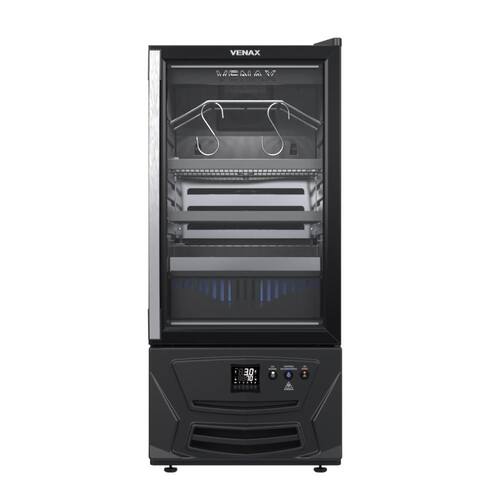 Tipo: Expositor maturador de carnes Marca: Venax Controlador de temperatura: Digital, regulável de -1C a 5C Sistema de refrigeração: Compressor Gás refrigerante: R134a Iluminação interna: Led branco Led antibactericida: Led UVC Porta: Vidro duplo (LOW-E) Puxador da porta: Alumínio escovado Abertura da porta: Esquerda para direita Aquecimento da porta: Sim Prateleiras: 2 Reguláveis Gancho para carnes: 2 unidades em aço inox Controle de umidade: Sim Evaporador: Ar forçado Degelo: Automático Dreno: Traseiro Recipiente de Degelo: Sim Gabinete interno: PSAI na cor preto Gabinete externo: Aço revestido com pintura eletrostática Pés: Frontais reguláveis e traseiros com rolete Carga máxima prateleira: 22,5 kg Carga máxima gancho: 22,5 kg Medidas do produto: Altura 110,5cm - Largura 49cm - Profundidade 61,2cm