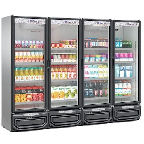Expositor Vertical Conveniência 4 Portas GCVR1950TI Gelopar. Conservação e Exposição de bebidas, frios e laticínios. Ideal para supermercados, restaurantes, lanchonetes e similares. Temperatura: 0 a +7C. Refrigeração: Ar forçado com evaporador aletado. Controlador eletrônico com indicador de temperatura. Degelo: automático (frost free). Iluminação LED (interna), com interruptor. Porta: Vidro duplo temperado baixo emissivo. Fechamento automático. Prateleiras aramadas: 4 níveis reguláveis e inclináveis. Revestimento Interno: Aço pré-pintado branco. Revestimento Externo: aço pré-pintado tipo inox. Pés niveladores. Perfil porta etiquetas. Vidros sujeitos a condensação da umidade do ar. Gás ecológico R290. ARMAZENAMENTO: 1836 latas 350ml, 1020 long necks 350 ml ou 600 garrafas pet 600ml. CAPACIDADE: 1979L. PESO: 265kg. TEMPERATURA: 0 a +7C. CONSUMO: 14,66 kWh/dia. FREQUÊNCIA: 60Hz. DIMENSÕES EXTERNAS (CxAxL): 260,5x196,2x68,5cm. Equipamento certificado conforme Portaria Inmetro n 371/2009. Expositor Refrigerador Vertical 4 Portas GCVR1950TI Gelopar é na OverFrio.