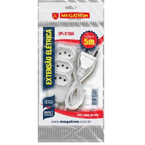 EXTENSAO 3 TOM. PARAL.3X0,75X5,00MT 2P+T 10A/250V BR MEGATRONApresentamos as extensões elétricas 2P T, produtos de qualidade e que garantem segurança aos usuários, atendendo ao novo padrão brasileiro de plugues e tomadas (NBR 14136). Este produto é produzido com cabo PP, que as torna ainda mais resistentes.Modelo: Extensão Elétrica Megatron 2P TAmperagem: 10A / 250VCabo: PPEspessura do Cabo: 0,75mm²Número de tomadas: 03Ideal para: Uso residencial e comercial*Imagens meramente ilustrativa.*Marca: MegatronCódigo:79886